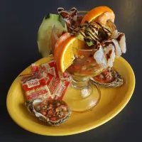 Cup of Shrimp, octopus, oyster, Tomato, onion, avocado, cilantro, cucumber and tomato juice.