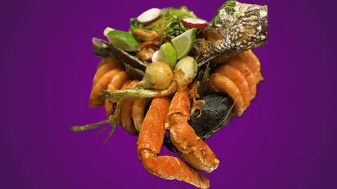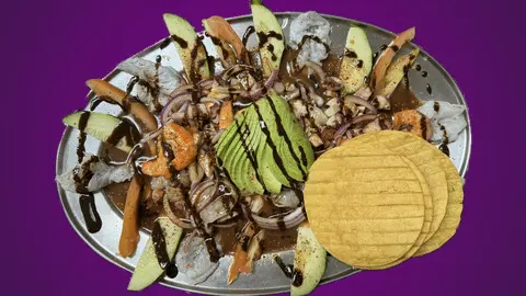 Tanned shrimp, cooked shrimp, octopus, scallops, oyster, onion, cucumber, avocado, tomato and Black Sauce.