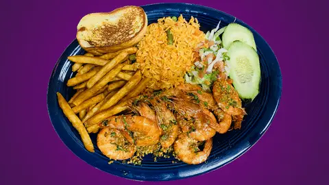 Shrimps Covered with your favorite Sauce (Devil, Garlic, Grilled and cucaracha) Served With Tomatoes And Cucumbers.