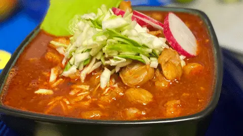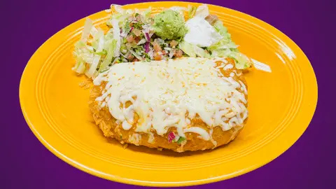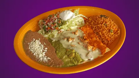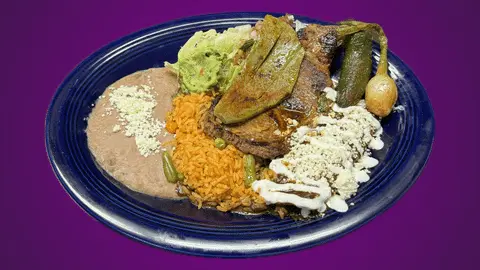 Grilled Steak accompanied with a cheese enchilada with mole sauce, rice, beans, lettuce, pico de gallo and corn or flour tortillas.