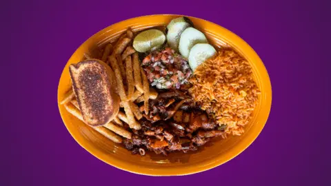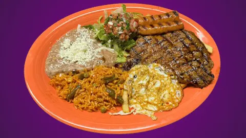 Grilled Steak Accompanied with fries and egg Served with rice, beans, lettuce, pico de gallo and corn or flour tortillas.