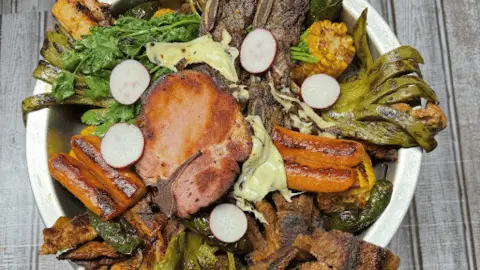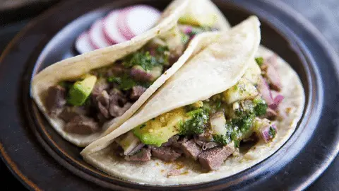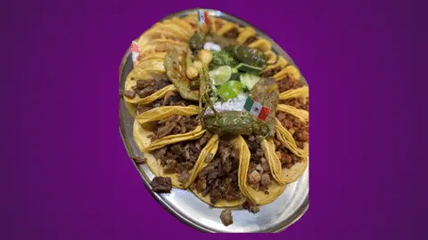 20 tacos, choose your 3 meats (tripe and tongue not included) served with chambray onions, roasted chilies, cucumber, radishes and lemons.